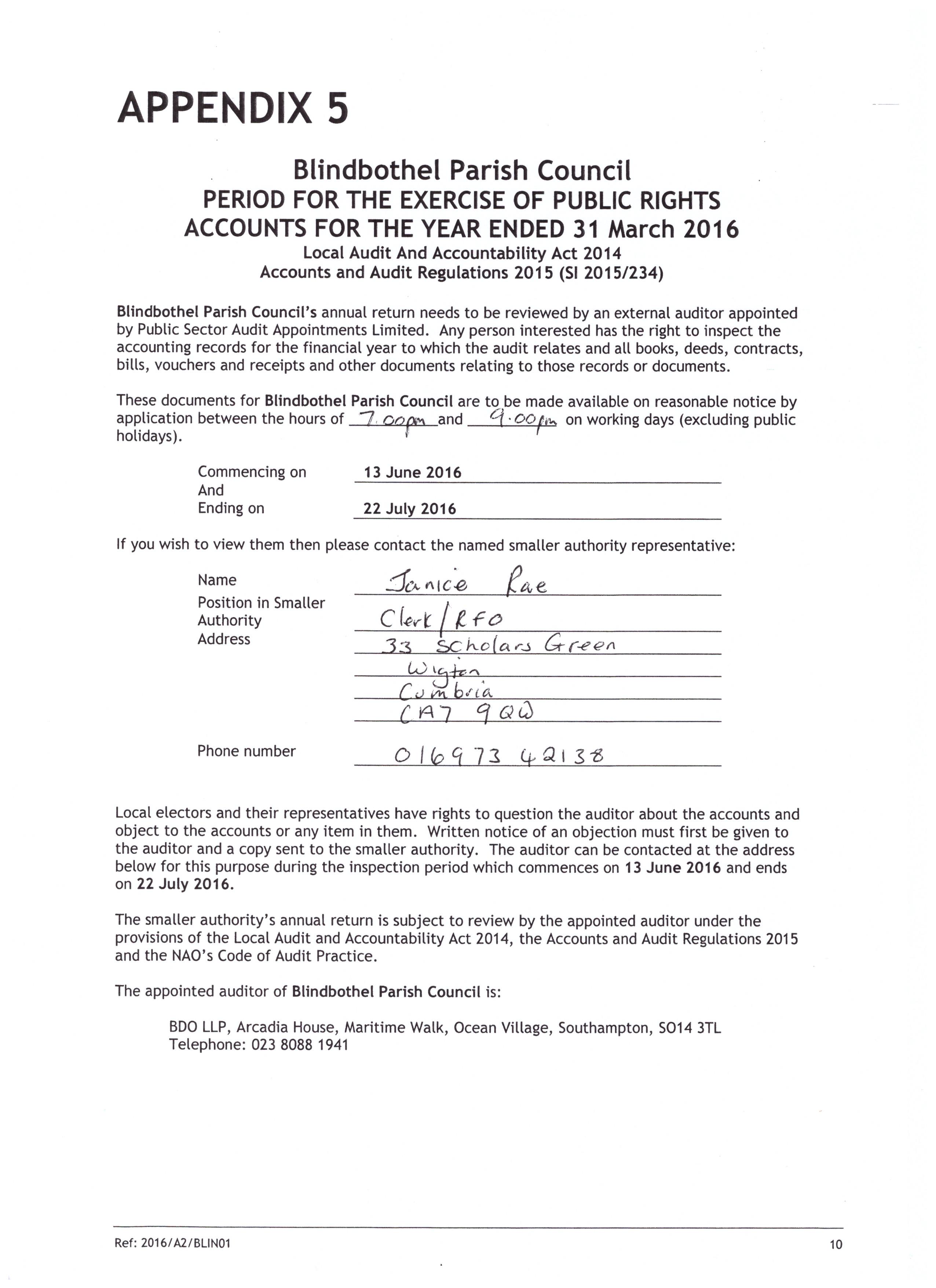 Clerk: Janice Rae c/o 1 Sun Croft, Ireby, Wigton, CA7 1ES