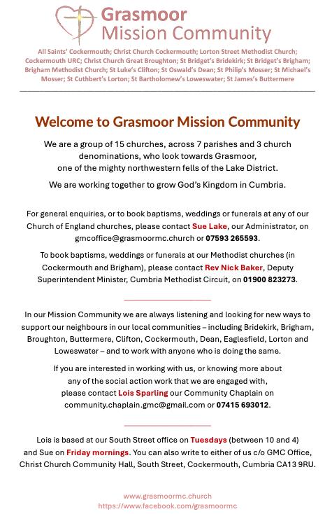 St Cuthbert’s church is a part of the Grasmoor Mission Community (GMC) of churches in, and to the north, south and west of, Cockermouth. Bookings for baptisms, weddings and funerals at St James’ are handled centrally by the GMC’s administrator, Sue, and the churches also employ a Community Chaplain, Lois, whose role is to help the churches serve their communities. For more information about the GMC and contact details for Sue and Lois, click here.